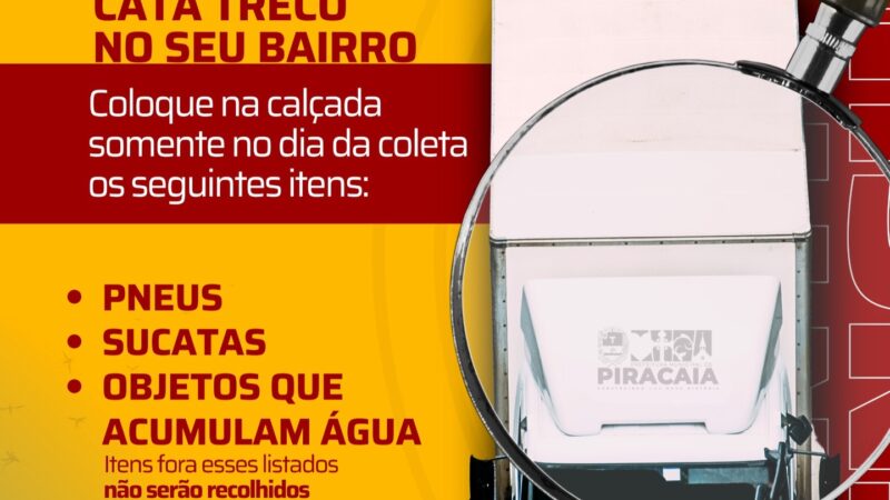 A Prefeitura de Piracaia, por meio da Secretaria Municipal de Saúde, informa que o Caminhão Cata-Treco passará pelos bairros para auxiliar no combate aos criadouros do mosquito Aedes aegypti. Confira as informações e prepare o seu descarte: 🗓️ DATA: 07 de fevereiro (sábado)🕙 HORÁRIO: A partir das 10h📍 BAIRROS ATENDIDOS: San Marino, Vila Pires e […]